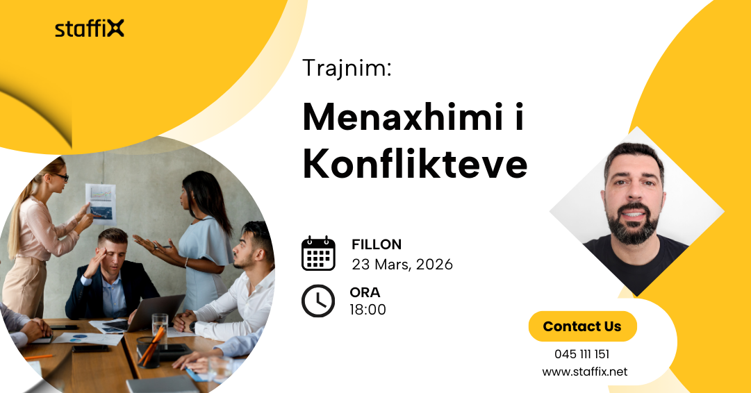 staffiX do të organizojë trajnimin e radhës në muajin Mars 2026 për Menaxhimin e Konflikteve në vendin e punës, i cili tashmë është zyrtarisht i hapur për aplikim. Përgjatë këtij trajnimi, pjesëmarrësit do të marrin njohuri të thelluara mbi parandalimin, menaxhimin dhe zgjidhjen e konflikteve, përmes qasjeve praktike dhe shembujve konkretë nga jeta organizative.